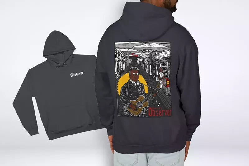 While he calls his art “low-brow lino cut,” I would not quite consider the messages of some of his pieces to be low-brow. The piece that he created for the Observer is anything but.