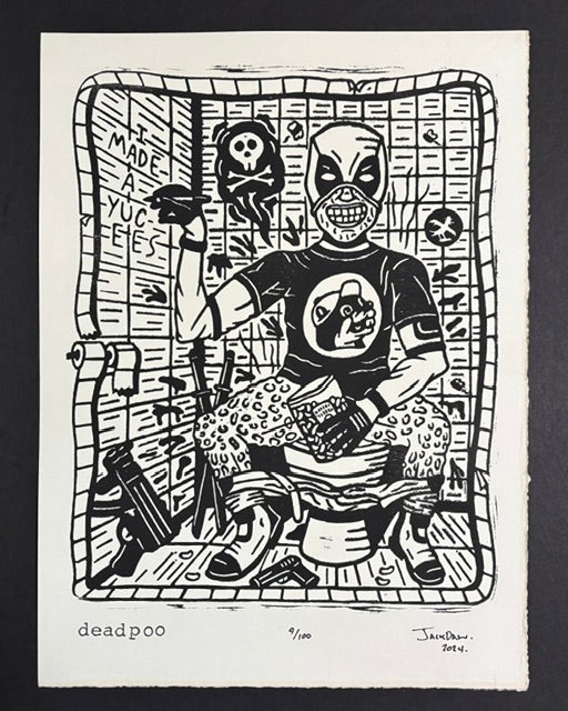 Each piece is carved by hand and lovingly and uniquely printed via old-timey roller press onto hand-torn and tea stained 140lb art paper.