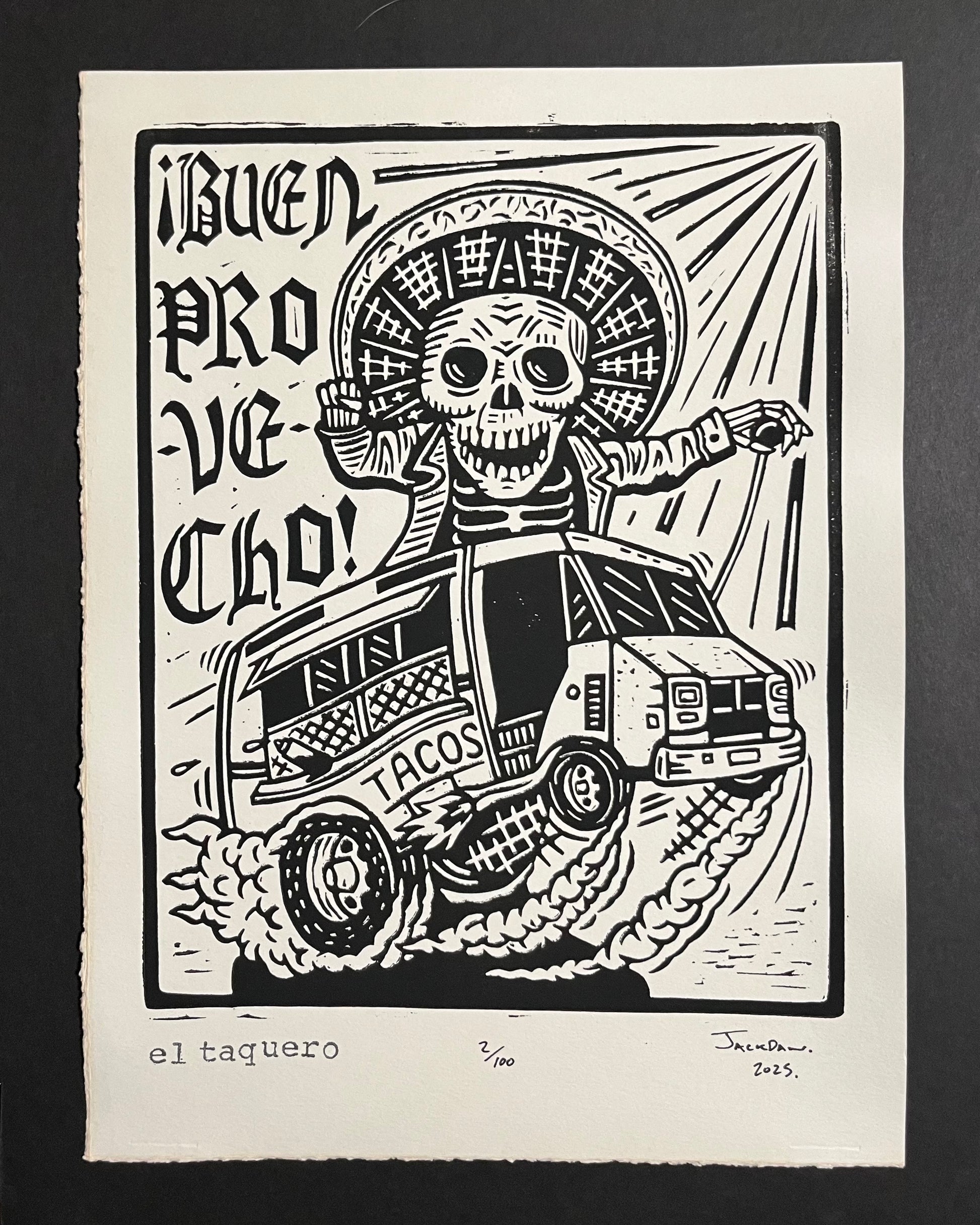 Each piece is carved by hand and lovingly and uniquely printed via old-timey roller press onto hand-torn and tea stained 140lb art paper.