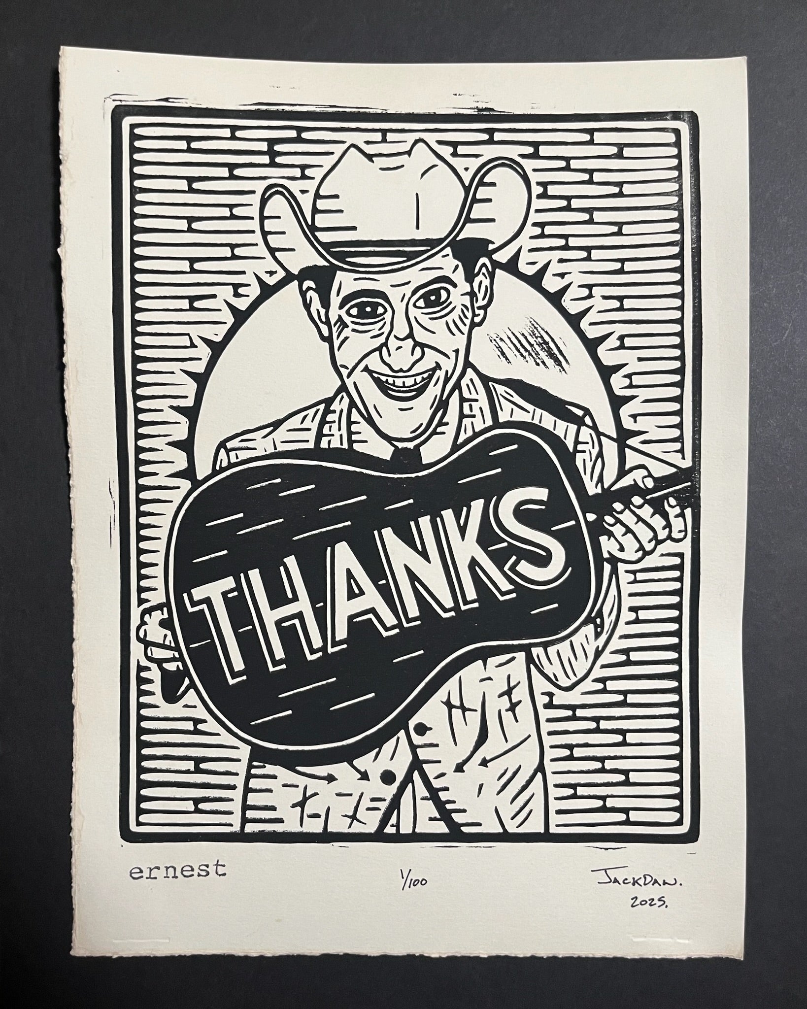 Each piece is carved by hand and lovingly and uniquely printed via old-timey roller press onto hand-torn and tea stained 140lb art paper.