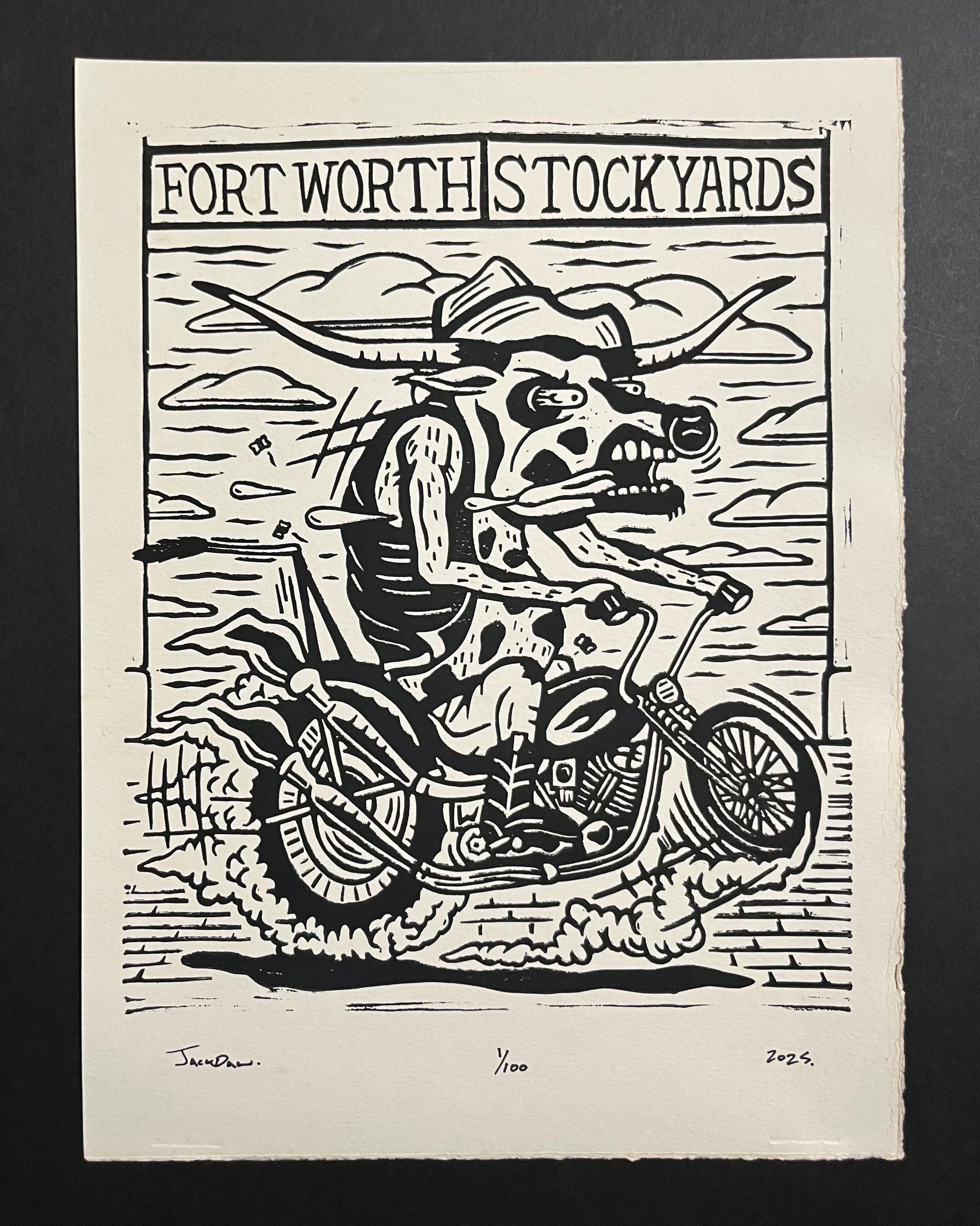 Each piece is carved by hand and lovingly and uniquely printed via old-timey roller press onto hand-torn and tea stained 140lb art paper.