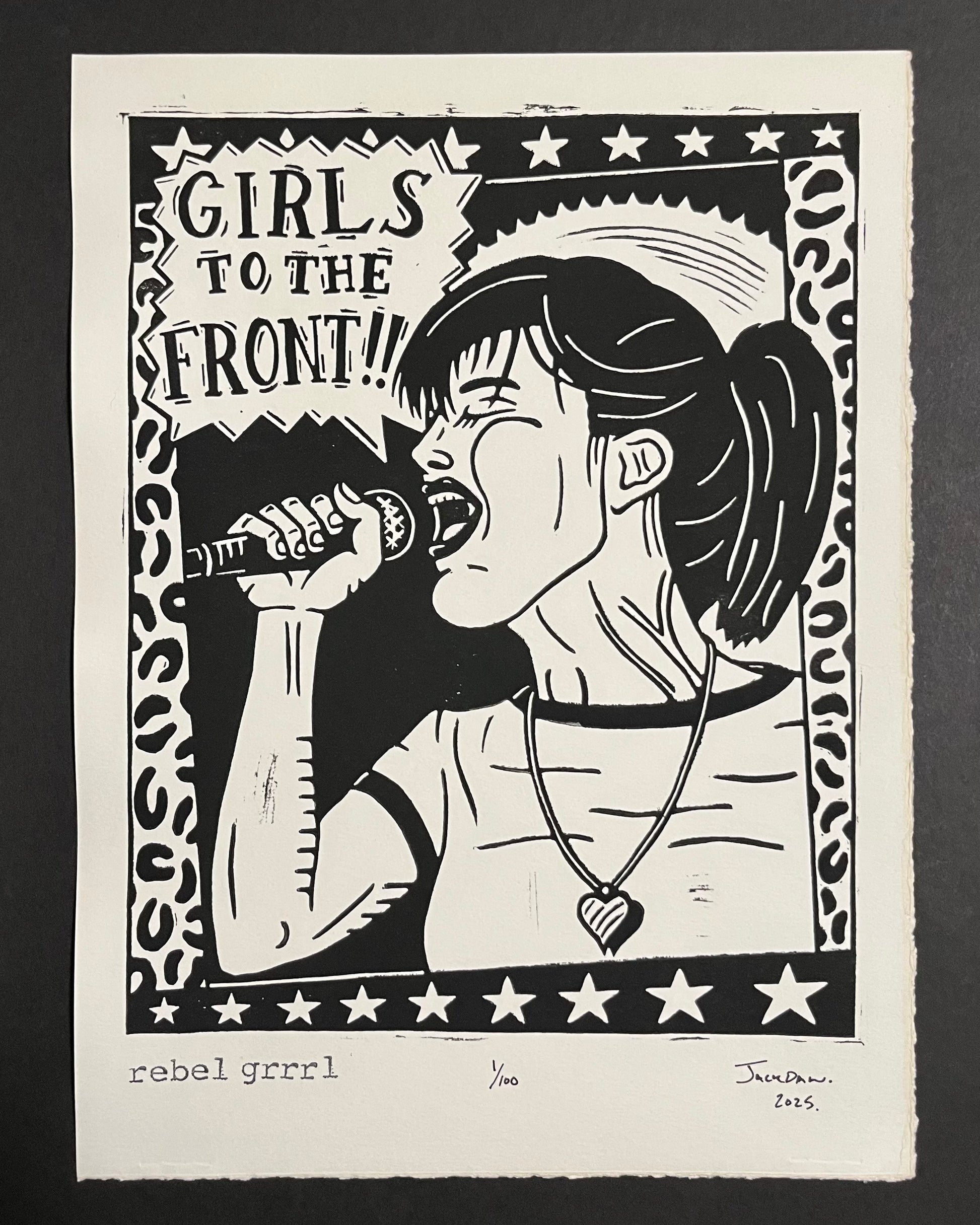 Each piece is carved by hand and lovingly and uniquely printed via old-timey roller press onto hand-torn and tea stained 140lb art paper.