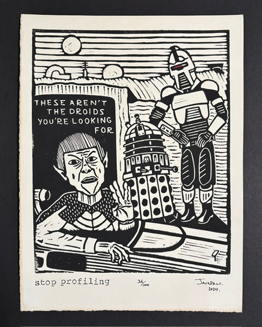 Each piece is carved by hand and lovingly and uniquely printed via old-timey roller press onto hand-torn and tea stained 140lb art paper.