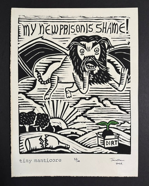 Each piece is carved by hand and lovingly and uniquely printed via old-timey roller press onto hand-torn and tea stained 140lb art paper.