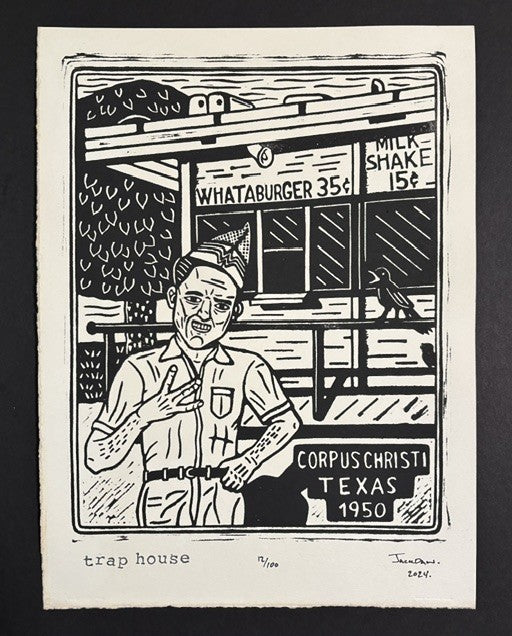 Each piece is carved by hand and lovingly and uniquely printed via old-timey roller press onto hand-torn and tea stained 140lb art paper.