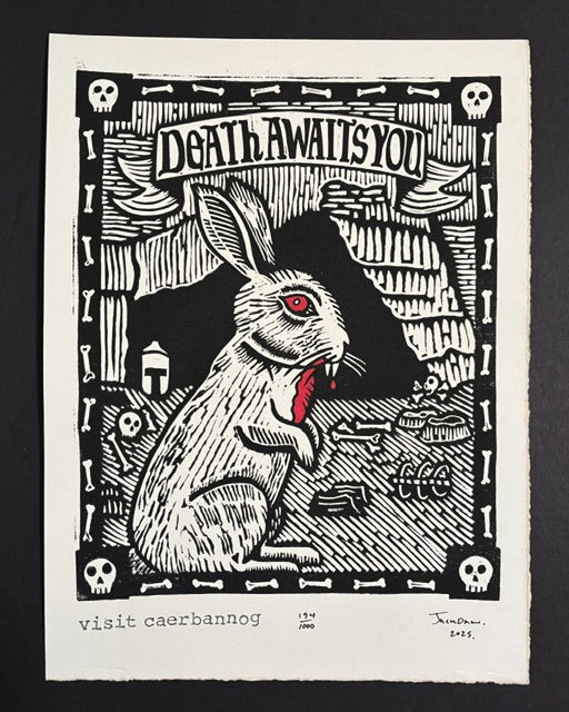Each piece is carved by hand and lovingly and uniquely printed via old-timey roller press onto hand-torn and tea stained 140lb art paper.